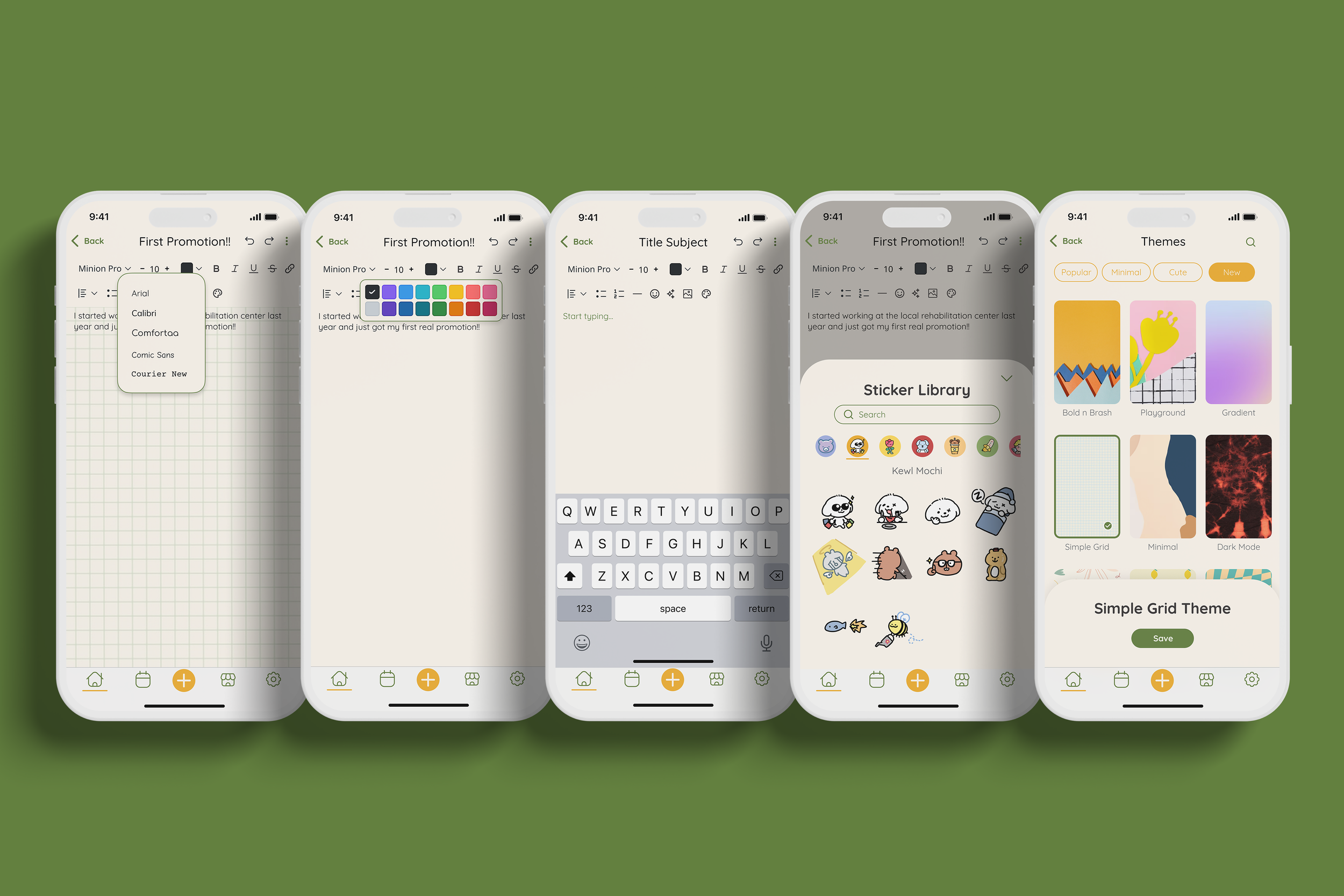 Customization is a highlighted feature of our app, which we chose to incorporate various levels of visual design. To make it easier for the user to navigate, we placed our main canvas’ customizable functions, including the sticker library, journal theme selection, typography options, and color swatch palettes in one area.